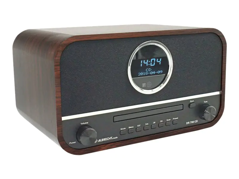 Erstmals bringt Albrecht mit dem DR 790 CD eine Kombination aus Digitalradio und CD-Player ins heimische Wohnzimmer. Zusätzlich bietet das Gerät weitere Betriebsmodi wie UKW-Radio, USB-Anschluss (für MP3-Player), Aux-In und Musik Streaming Funktion (z. B. Spotify vom Smartphone). 20 Senderspeicher ermöglichen das komfortable und schnelle Suchen und Auswählen der persönlichen Lieblingsradiostationen. Das wertige Holzgehäuse sorgt mit zwei starken 15 Watt Lautsprechern für eine exzellente Klangqualität. Ein optischer Blickfang des Gerätes ist das runde LC-Display in stylischer Bullaugenoptik.