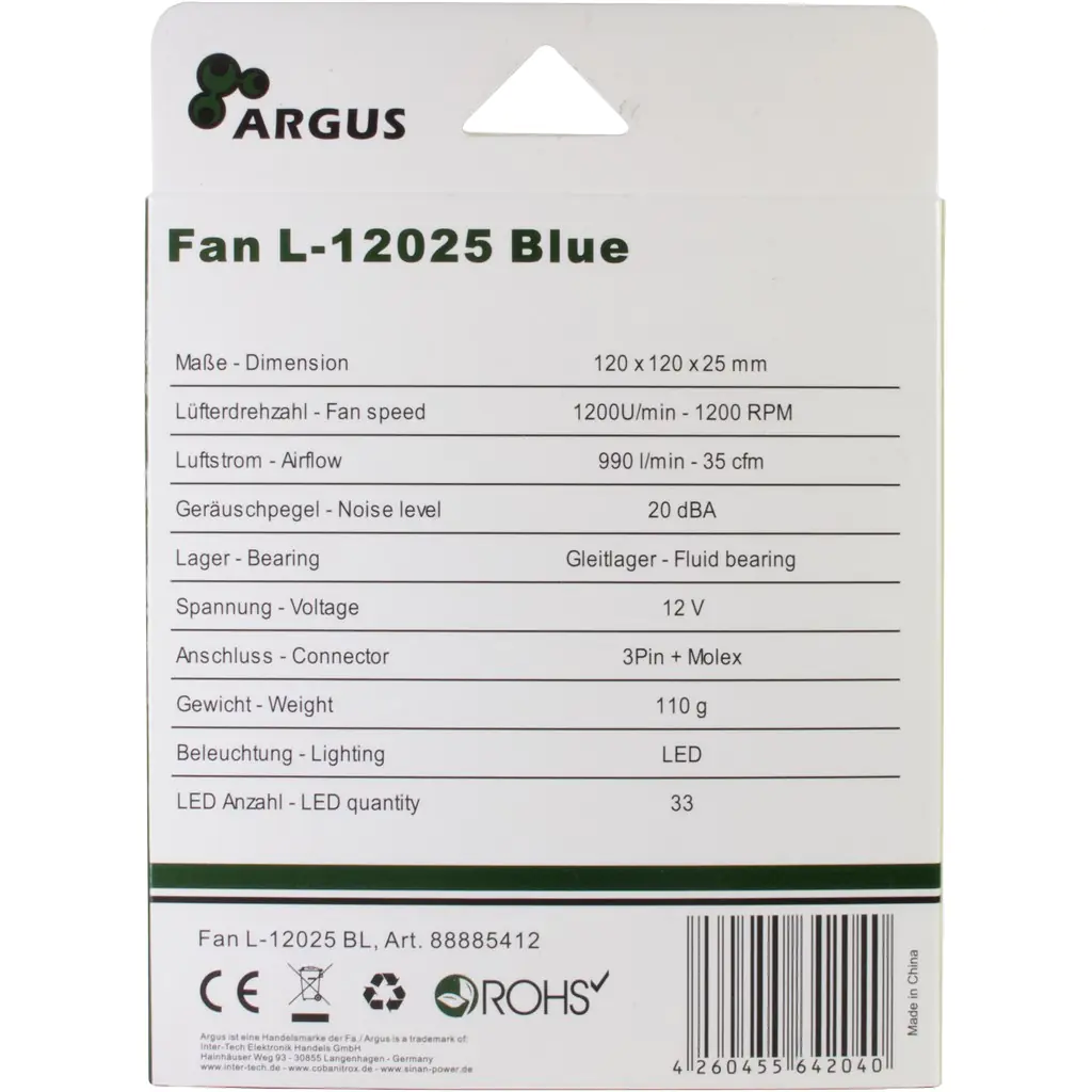 | Inter-Tech Argus L-12025 - Gehäuselüfter - 120 mm - Blau | ||||