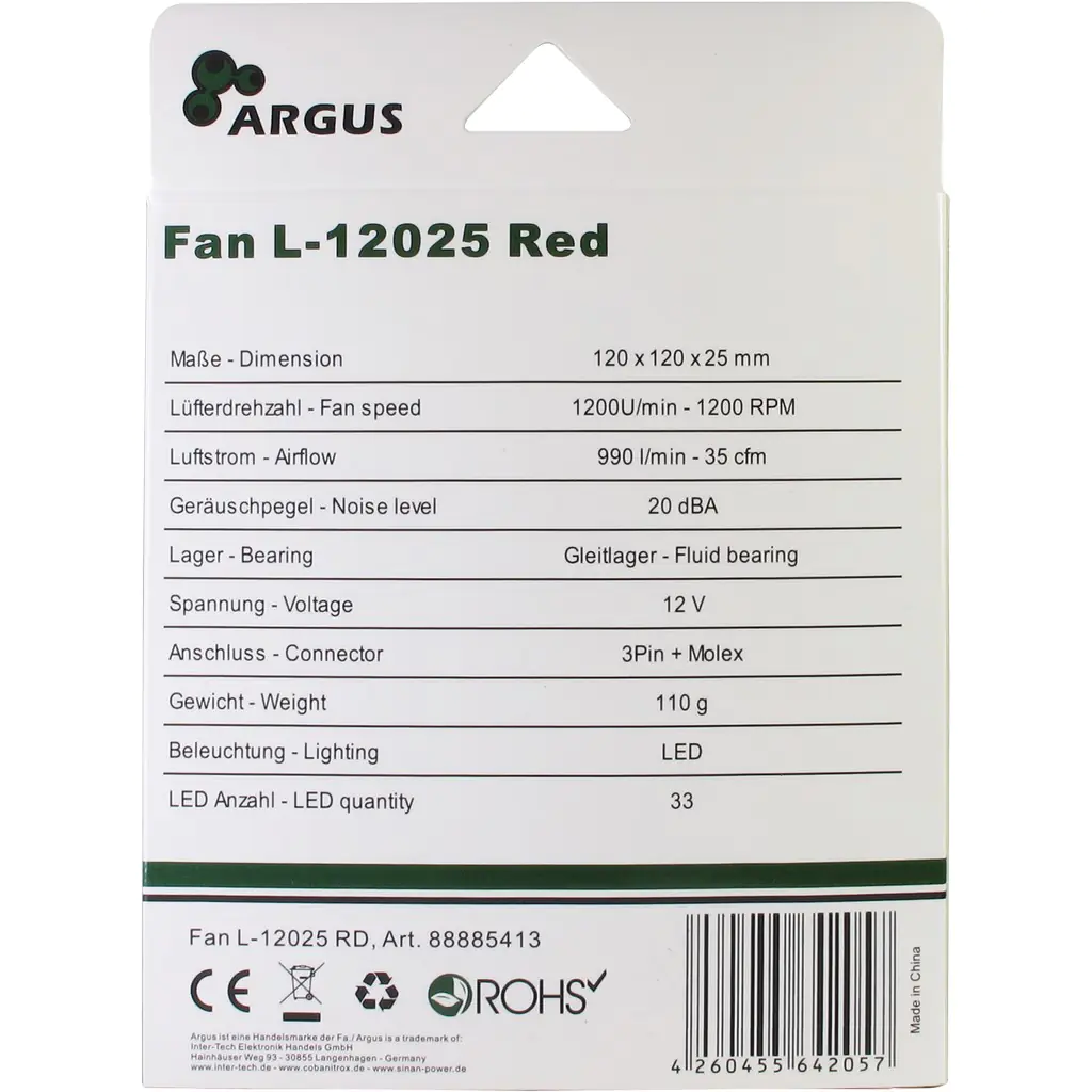 | Inter-Tech Argus L-12025 - Gehäuselüfter - 120 mm - Rot | ||||