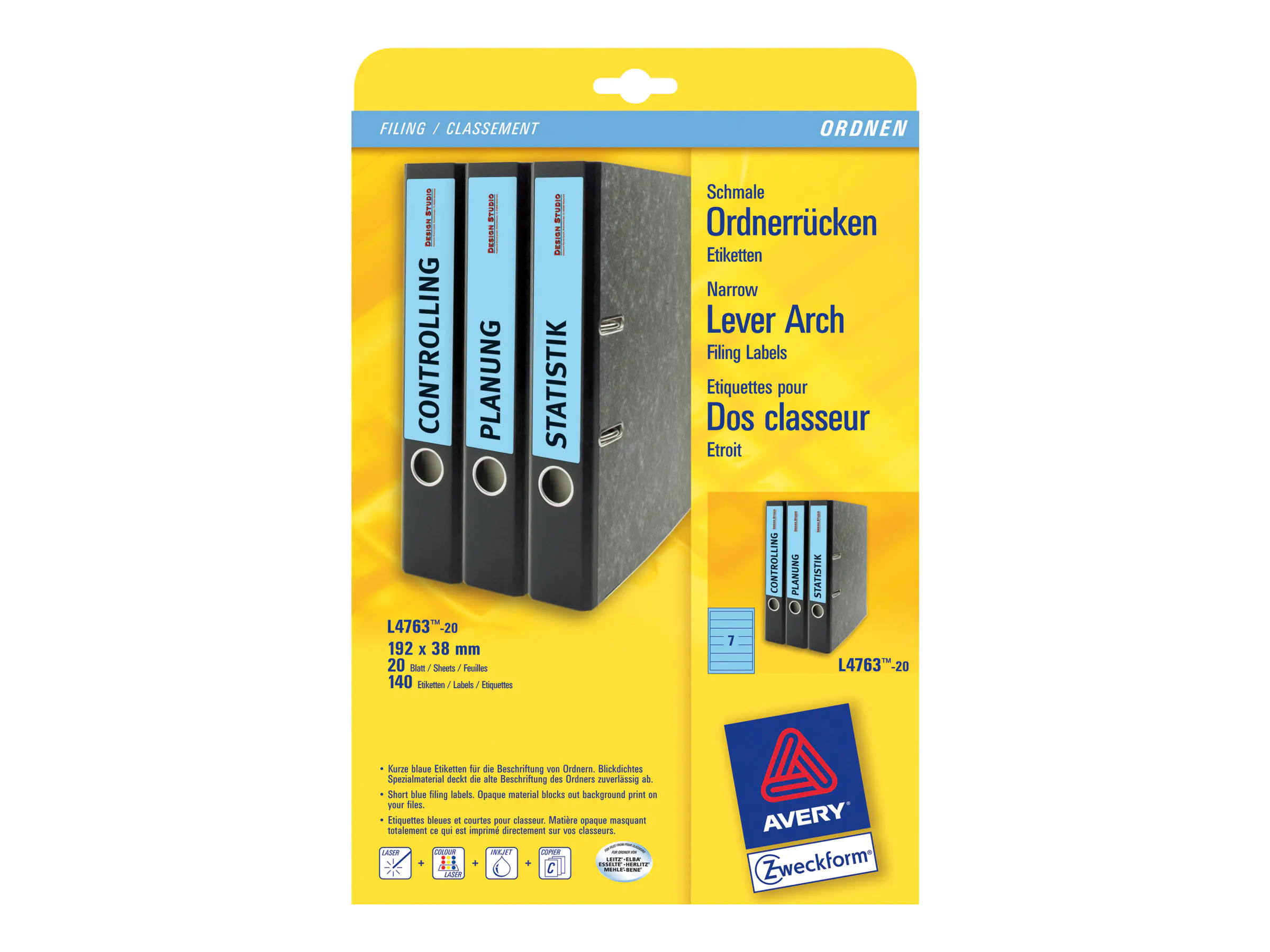 Präziser Druckereinzug und garantiert staufrei dank innovativer ultragrip Technologie. Problemloser Druckerdurchlauf für Laserdrucker bestätigt. Halten Sie Ordnung in Ihren Unterlagen mit bedruckbaren Ordner-Etiketten. Die alte Beschriftung scheint nicht durch. Die Rückenschilder lassen sich mit allen gängigen Druckern und Kopierern bedrucken. Gestalten und bedrucken Sie die Ordner-Etiketten mit unserer kostenlosen und benutzerfreundlichen Software. www.avery-zweckform.eu/print.