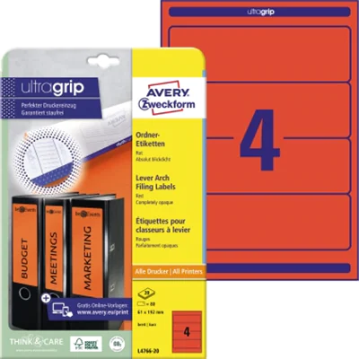 Präziser Druckereinzug und garantiert staufrei dank innovativer ultragrip Technologie. Problemloser Druckerdurchlauf für Laserdrucker bestätigt. Halten Sie Ordnung in Ihren Unterlagen mit bedruckbaren Ordner-Etiketten. Die alte Beschriftung scheint nicht durch. Die Rückenschilder lassen sich mit allen gängigen Druckern und Kopierern bedrucken. Gestalten und bedrucken Sie die Ordner-Etiketten mit unserer kostenlosen und benutzerfreundlichen Software. www.avery-zweckform.eu/print.
