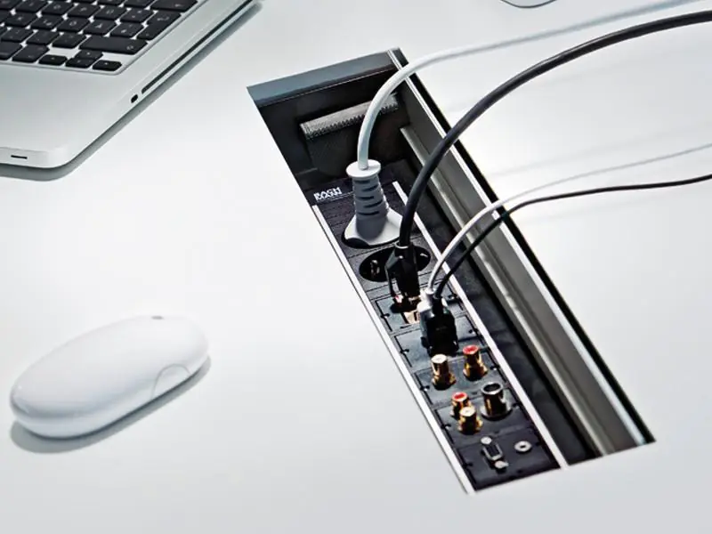Conference Einbaurahmen gibt es sowohl für den nachträglichen Einbau, als auch für den bündigen Einbau in Tischplatten. Beim Untertischeinbau sind Öffnungs- und Verschlussklappe bündig mit der Tischoberfläche.