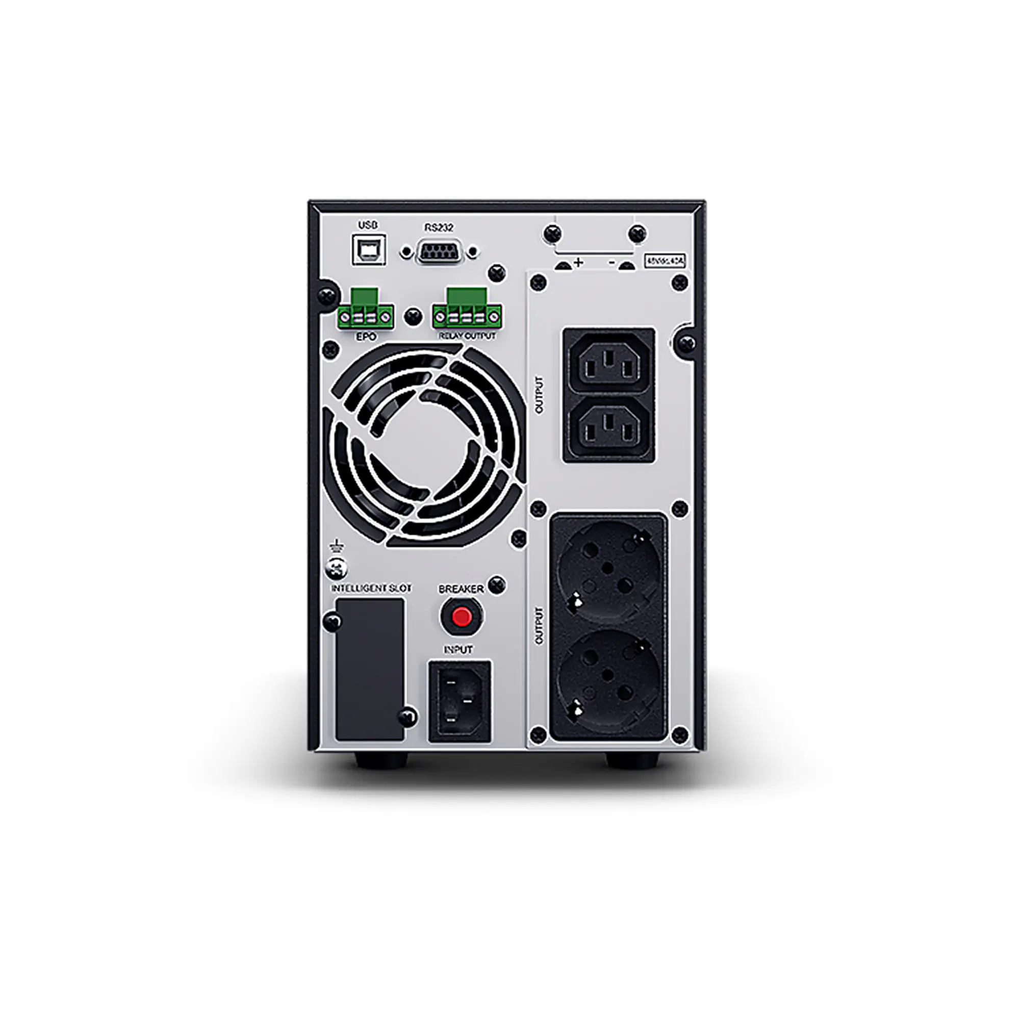 Die USV verfügt über eine Farb-LCD-Anzeige, über die der Benutzer das Stromversorgungssystem überwachen und Einstellungen einfach konfigurieren kann. Daneben steht für Sonderanwendungen eine Relais-Trockenkontaktschnittstelle zur Verfügung. Diese Modelle haben eine automatische Erkennung von extern angeschlossenen Batteriemodulen um automatisch die Anzahl der angeschlossenen Batteriemodule (EBM) zu erkennen und so eine korrekte Laufzeit der USV anzuzeigen. Die drehzahlvariable Lüftersteuerung bietet durch das automatische Wärmemanagement auf der Grundlage der Belastung eine reduzierte Geräuschentwicklung.