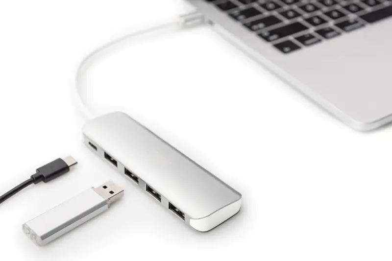 - Laden Sie Ihren angeschlossenen Laptop über den USB-C Port am Hub