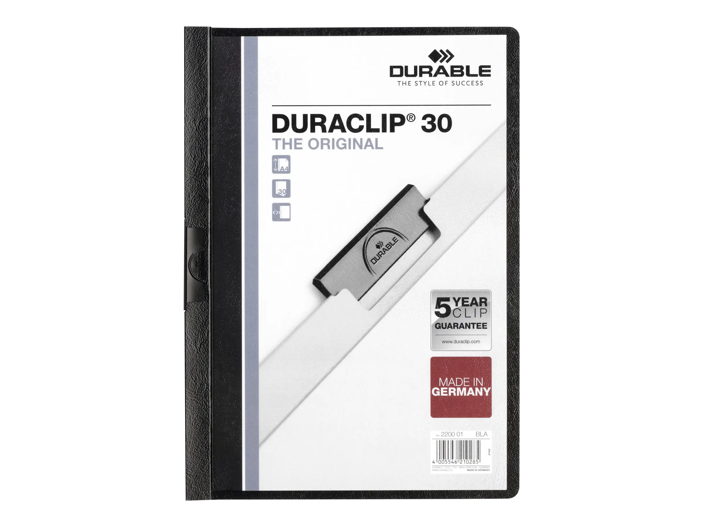 Durable DURACLIP 30. Produktfarbe: Schwarz, Transparent, Material: PVC, Maximale Kapazität: 30 Blätter. Menge pro Packung: 1 Stück(e)