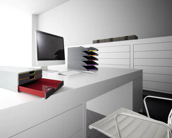 Schreibtischorganisation: Für einen aufgeräumten und produktiven Arbeitsplatz bietet Durable eine breite Palette an Schreibtisch-Organizern. Von Stiftköchern und Briefablagen bis hin zu modernen Monitorständern und ergonomischen Fußstützen – jedes Produkt wurde mit dem Ziel entwickelt, den Komfort zu erhöhen und die Effizienz zu steigern.