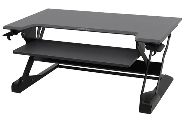 - Wechseln Sie während der Arbeit unmittelbar vom Sitzen zum Stehen oder umgekehrt: Einfach die Handbremsenhebel an beiden Geräteseiten lösen, um die Arbeitsfläche höher oder niedriger zu positionieren