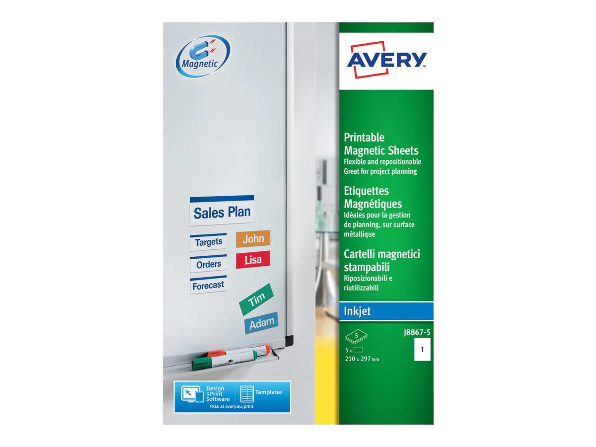 Verwenden Sie die Magnetschilder von Avery Zweckform für Besprechungen. Drucken Sie Ihre Ideen, Arbeitsschritte oder die Namen Ihrer Team-Mitglieder auf die Schilder und heften Sie diese an Ihr Flipchart. Die Magnet-Schilder sind besonders gut geeignet für das Sortieren von Ideen, aber auch für wechselnde Hinweisschilder oder für Urlaubs- und Schichtplanung auf einer Magnettafel. Gestalten und bedrucken Sie die Magnetschilder mit den anwendungsfreundlichen Druckvorlagen und der benutzerfreundlichen Software von Avery Zweckform. Achtung: Die Magnet-Schilder weisen ein hohes Gewicht auf. Bitte stellen Sie vor dem Bedrucken sicher, dass Ihr Inkjet-Drucker dickes und schweres Material verarbeiten kann. Informationen hierzu finden Sie in Ihrem Drucker- Handbuch.