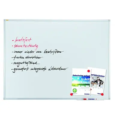 Whiteboards und Magnettafeln: Das Herzstück des Franken-Sortiments sind die Whiteboards und Magnettafeln, die in einer Vielzahl von Größen und Ausführungen erhältlich sind. Die Oberflächen sind perfekt für das Schreiben mit Markern und das Anbringen von Notizen mit Magneten geeignet. Sie sind robust, leicht zu reinigen und ideal für Brainstorming, Meetings und Unterricht.