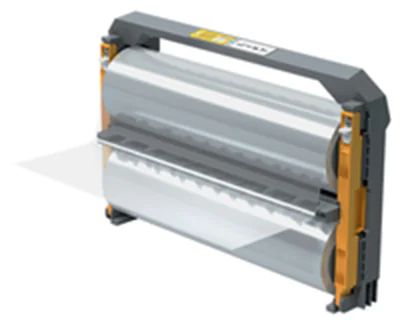Nachfüllbare Folienkassette. Einfach die leere Kassette herausnehmen, Kassettenhebel öffnen, eine Ersatzrolle einsetzen und Hebel schließen. Die komplette Kassette wird dann ganz einfach wieder in das Laminiergerät eingelegt.