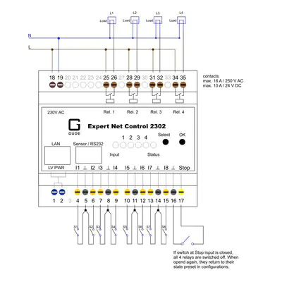 Expert Net Control 2302-1 ist ein Remote I/O-System bietet verschiedene Möglichkeiten des Fernwirkens über ein TCP/IP-Netzwerk. Das Gerät verfügt über vier einzeln schaltbare, potenzialfreie Relaisausgänge und acht passive Signaleingänge für die Abfrage von NO/NC-Geräten (z. B. Rauchmelder und Türkontakte). Dank Sensoranschluss (RJ45) lässt sich das Fernwirksystem mit optional erhältlichen Sensoren erweitern und es können Umgebungstemperatur, Luftfeuchtigkeit, Luftdruck sowie Leckage überwacht werden. Neben der Kommunikation über Telnet, Radius und Modbus TCP werden moderne Sicherheitsstandards wie SNMPv3, SSL und IPv6 unterstützt.