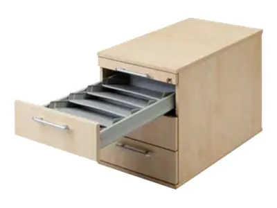 Zentralverriegelung. Relinggriff. Teleskop-Metall-Kugelführungen mit Selbsteinzug. Container gleichschließend. Korpus verleimt, 2 mm Kunststoff-Kante gerundet. Stellfüße und Griffe müssen montiert werden. Rollen im Boden eingelassen.