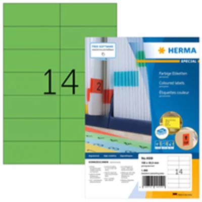 HERMA 4559. Produktfarbe: Grün, Form: Rechteck, Format: A4. Breite: 105 mm, Höhe: 42,3 mm. Aufkleber pro Satz: 1400 Stück(e), Medienanzahl pro Paket: 100 Blätter