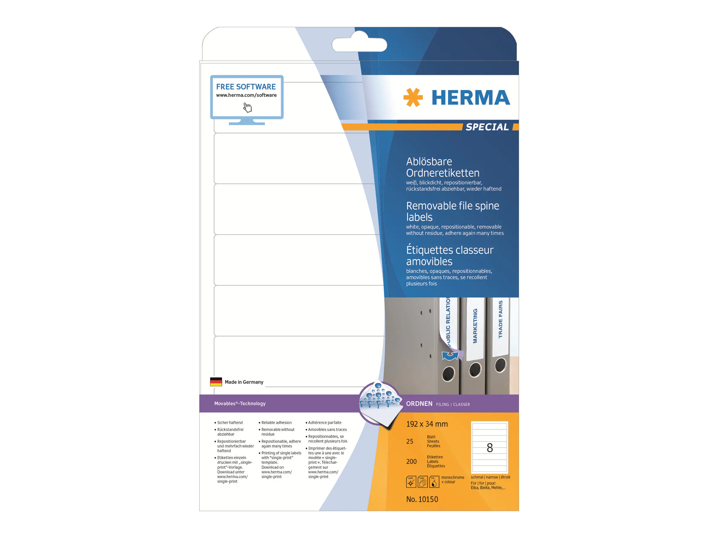 Beschreibung | HERMA Special - Papier - matt - selbstklebend, entfernbarer Klebstoff - weiß - 192 x 34 mm 200 Etikett(en) (25 Bogen x 8) undurchsichtige Aktenetiketten | |||