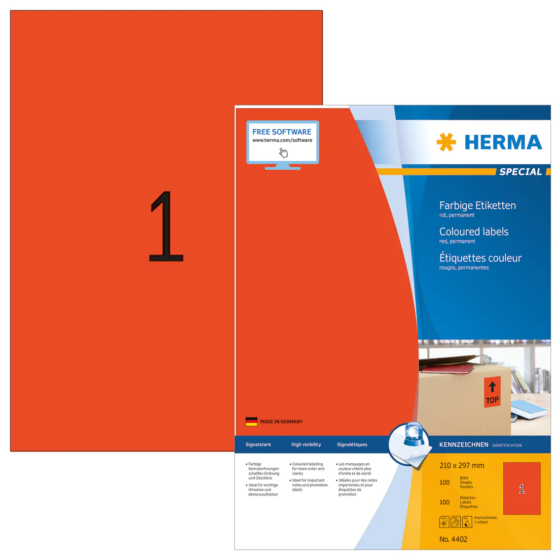 Beschreibung | HERMA Special - Papier - matt - permanent selbstklebend - Rot - A4 (210 x 297 mm) 100 Etikett(en) (100 Bogen x 1) Etiketten | |||