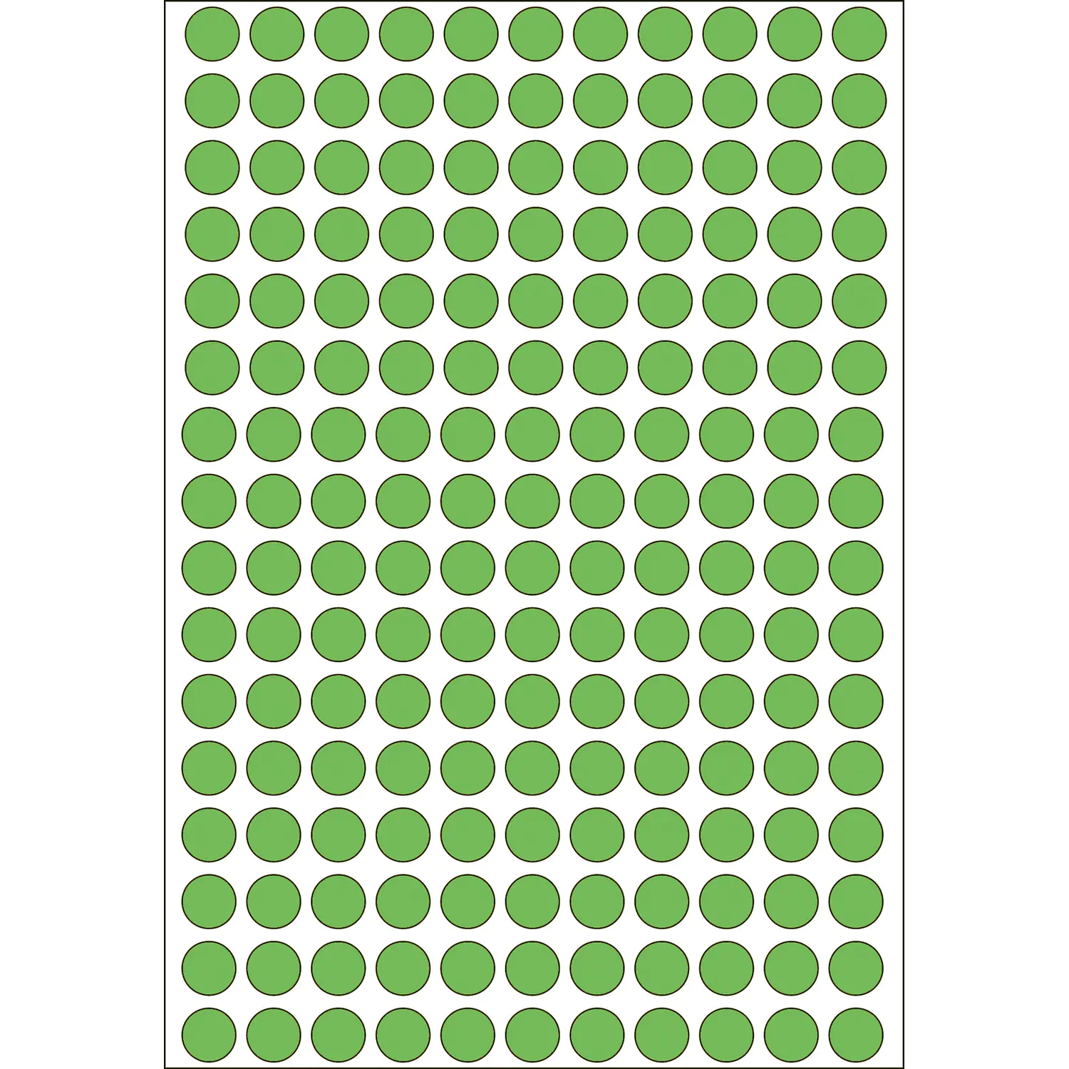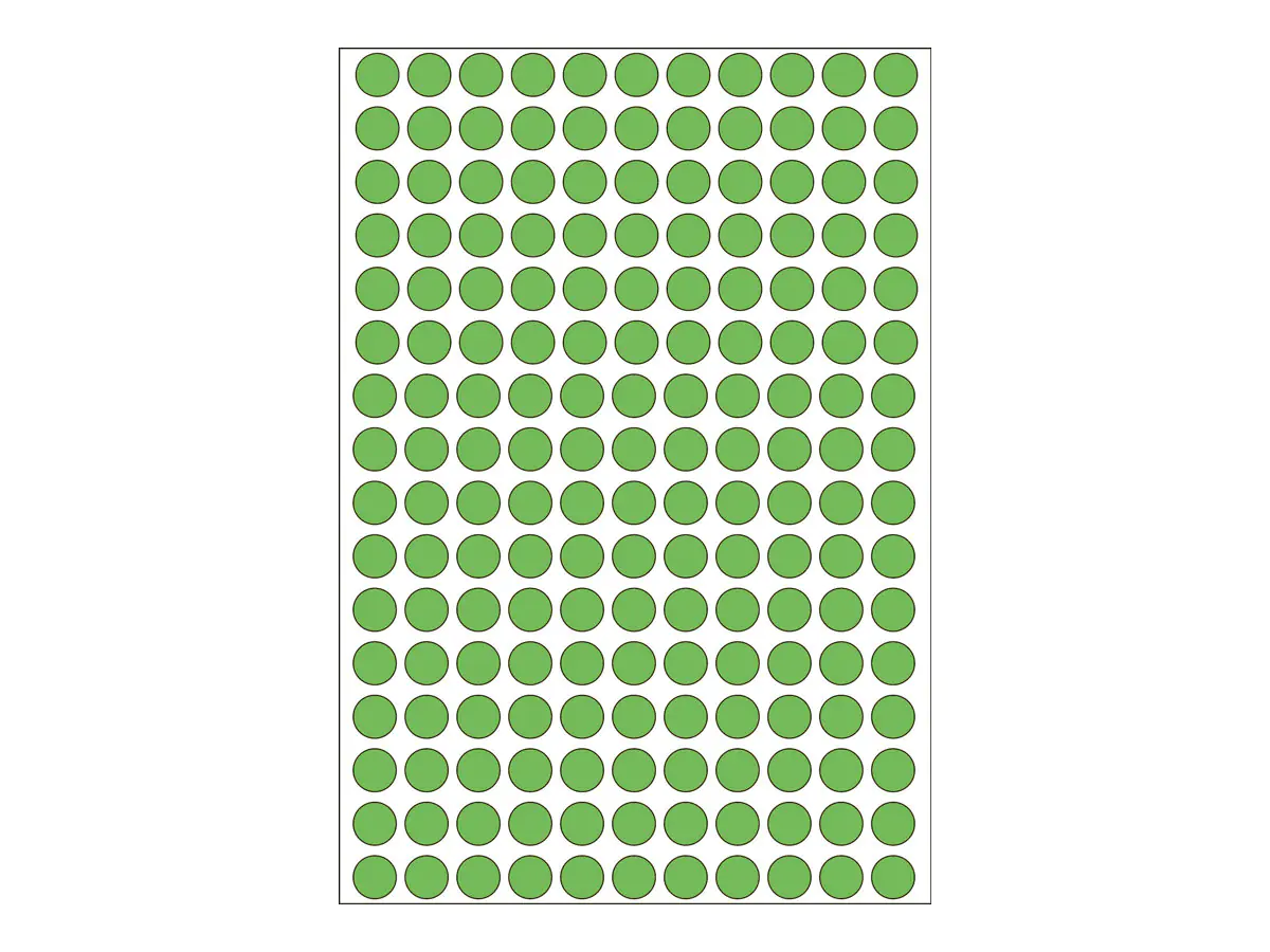 Beschreibung | HERMA Permanenter Klebstoff - grün - 8 mm rund 5632 Etikett(en) (32 Bogen x 176) Etiketten | |||