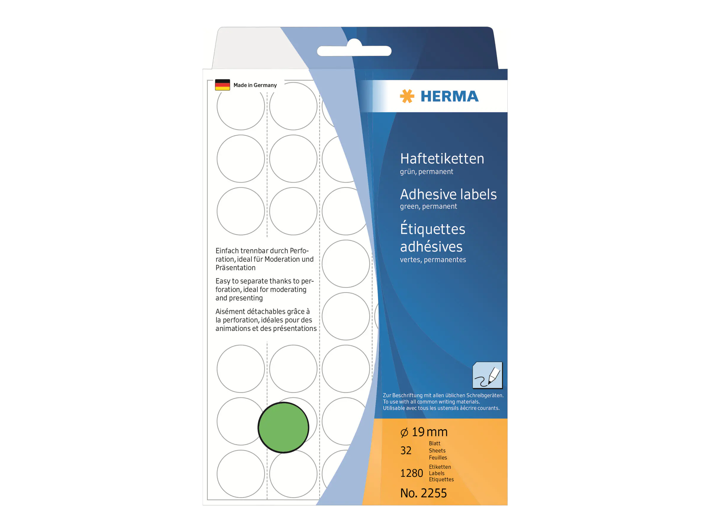 Beschreibung | HERMA Papier - permanenter Klebstoff - grün - 19 mm rund 1280 Etikett(en) (32 Bogen x 40) Mehrzwecketiketten | |||