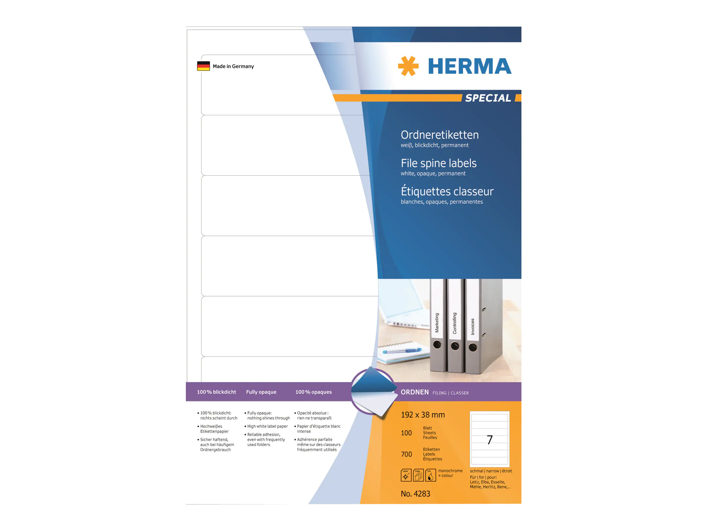 Beschreibung | HERMA Special - Papier - matt - permanent selbstklebend - weiß - 192 x 38 mm 700 Etikett(en) (100 Bogen x 7) undurchsichtige Aktenetiketten | |||