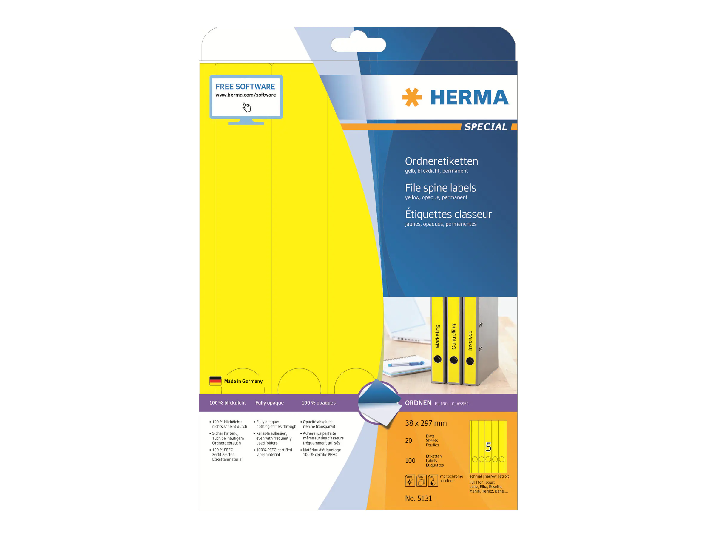 HERMA Ordneretiketten 5131 DIN A4 38x297mm gelb 100 St./Pack