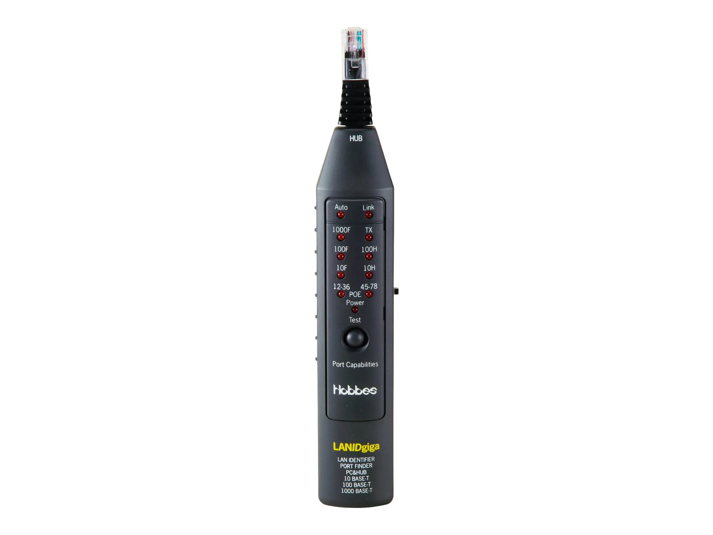 Der Hobbes LANIDgiga ist eine verbesserte Version des erfolgreichen LANID Pro. Der Hobbes LANIDgiga ist ein hocheffizientes Prüfgerät, um schnell und zuverlässig den Netzwerkstatus festzustellen und mit mittels LED anzuzeigen. Diagnostizieren Sie gezielt bestehende Probleme im Netzwerk während der LAN Installation oder bei der Instandhaltung der LAN Geräte oder Ports.