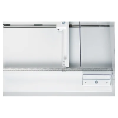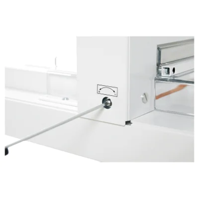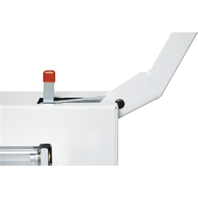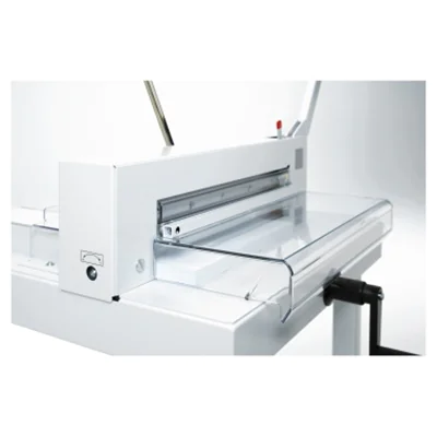 Besonders sicher durch SCS-Sicherheitspaket (Safety Cutting System): Schwenkbare, transparente Sicherheitsvorrichtung auf dem Vordertisch (wird während des Schneidens automatisch verriegelt); transparente Sicherheitsvorrichtung auf dem Rücktisch; Sperrklinke für Messerarretierung (Messerhebel in oberster Position). Sicherer, einfacher Messerwechsel von vorne ohne Abnahme von Gehäuseteilen; Messerwechsel-Vorrichtung mit abgedeckter Messerschneide. Messertiefgangverstellung von außen; Schnittleiste zum bequemen Drehen oder Austauschen seitlich entnehmbar. Hochwertiges Messer aus Qualitäts-Messerstahl. Gehärtete, einstellbare Messerführungen. Patentierte Hebelschnellpressung. Seitenanschlag mit Maßskala (mm / inch). Spindelgeführter Rückanschlag mit Handkurbel. Maß-Feineinstellung über Skalenring an der Handkurbel des Rückanschlags.