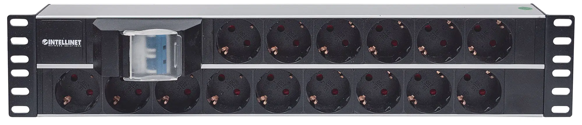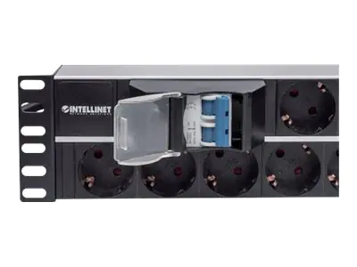 Intellinet 19" 15-fach Steckdosenleiste, Schutzkontakt, Doppelter Leitungsschutzschalter, 3 m Stromkabel, 2 HE - Steckdosenleiste (Rack - einbaufähig) - Wechselstrom 250 V - Eingabe, Eingang CEE 7/4 - Ausgangsanschlüsse: 15 (CEE 7/3) - 2U - 48.3 cm (19")
