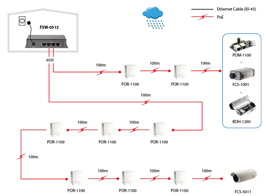 Der FSW-0513 ist ein 10/100 Mbit/s schneller Ethernet-Switch mit 4 leistungsstarken Power-over-Ethernet-Ports und einem Uplink-Port. Mit einem Gesamtleistungsbudget von 120 W eignet sich der FSW-0513 hervorragend für die Bereitstellung von Netzwerkgeräten, die eine hohe Leistung benötigen, wie z. B. Dome-Kameras für die Außenüberwachung und Access Points. Und mit High-Power-PoE kann die Reichweite der Geräte um Hunderte von Metern erweitert werden. Mit 4 Dip-Schaltern kann jeder PoE-Port manuell für die Ein-Aus-Steuerung eingestellt werden. Das interne PoE-Netzteil kann bis zu 48 Watt an einen einzelnen Port senden. Der FSW-0513 hat eine kompakte Größe und ist daher ideal für Desktop-Benutzer mit begrenztem Platzangebot. Der FSW-0513 unterstützt Stromschutzfunktionen wie OVP (Over Voltage Protection), OCP (Over Current Protection), robusten Kurzschlussschutz und Überspannungsschutz.