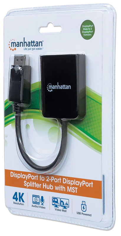 | Manhattan DisplayPort 1.2 to 2-Port DisplayPort 1.2 Splitter Hub with MST, 4K@30Hz, USB-A Powered, Video Wall Function, Black, Three Year Warranty, Blister | ||||