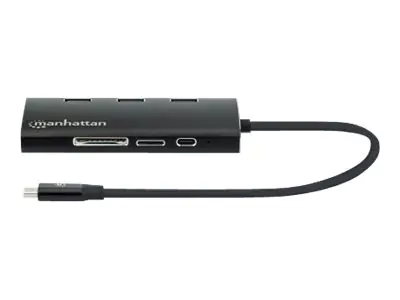 Manhattan USB-C Dock/Hub with Card Reader, Ports (x6): Ethernet, HDMI, USB-A (x3) and USB-C, With Power Delivery (100W) to USB-C Port (Note additional USB-C wall charger and USB-C cable needed), Aluminium, Black, 3 Year Warranty - Dockingstation - USB-C 3