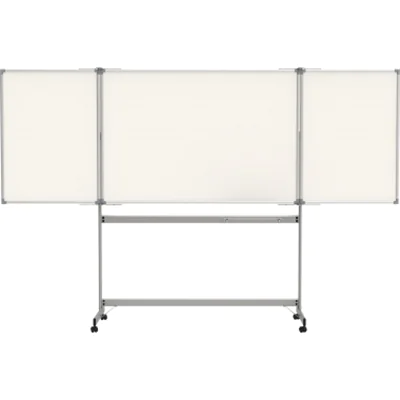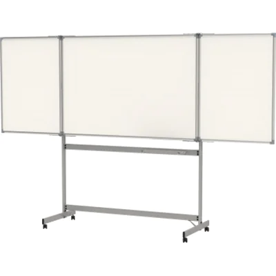 Das Platzwunder: Große Schreibfläche auf kleinstem Raum. Das Beste an Stabilität, Funktion und Qualität. Extrem robust: Äußerst stabiles Gestell, massive Flügel-Scharniere, große Rollen. Extrastarke Stahl-Arbeitsfläche auf formstabilem Kern in Sandwichtechnik. Besonders im Design. Arbeitsfläche in Sandwichtechnik dämmt Geräusche bei der Verwendung. Die Dicke des Stahlbleches erhöht die Haftkraft. Sechs beschriftbare Seiten, zwei ausklappbare Flügel. Schreibfläche 6 m². Flügel jeweils 100 x 75 cm, Außenmaß geschlossen, 150 x 195 x 65 cm. Neodym-Magnete halten die Tafel verschlossen.