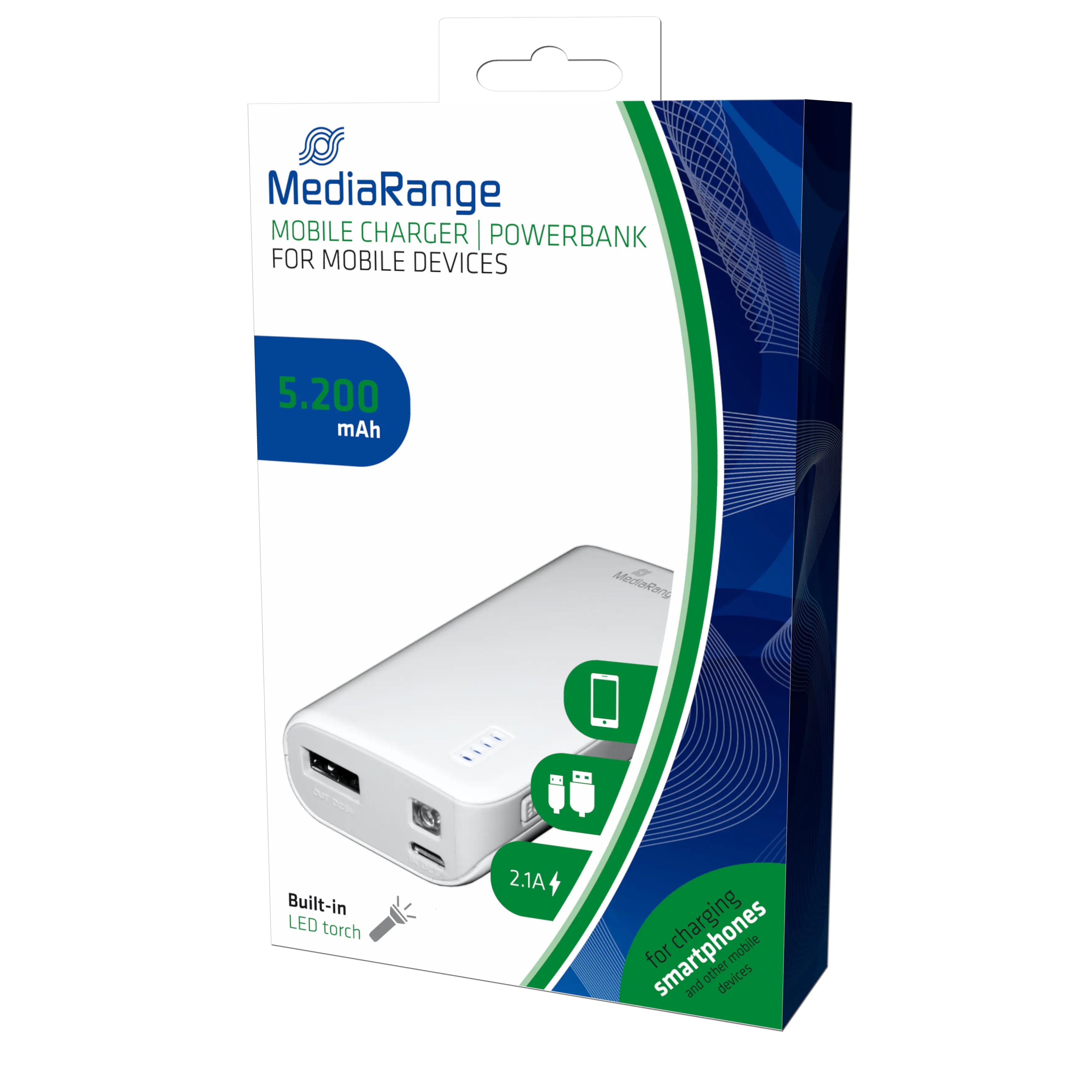MediaRange Mobile Charger - Powerbank - 5200 mAh - 2.1 A (USB) - auf Kabel: Micro-USB - Grau, weiß