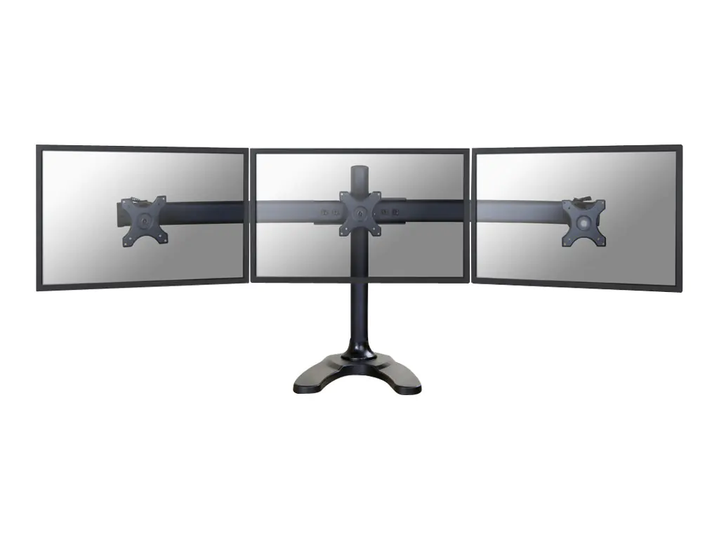 Die Neomounts by Newstar Tischhalterung, das Modell FPMA-D700DD3, ist eine schwenk- und drehbare Tischhalterung für drei Flachbildschirme bis 27" (69 cm). Diese Halterung ist eine gute Wahl für platzsparende Platzierung auf Schreibtischen mit einem Tischständer oder einer Tischplattenbohrung.
