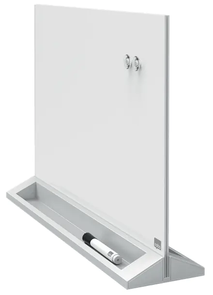 Diese beidseitig beschriftbare, magnetische Glas Desktop-Tafel überzeugt durch ihr rahmenloses Design und die hochwertige Oberfläche aus gehärtetem Sicherheitsglas und ergänzt jeden Arbeitsbereich zu Hause oder im Büro. Die trocken abwischbare Oberfläche lässt sich sehr leicht reinigen und macht die Tafel zum idealen Hilfsmittel zum Anfertigen von Notizen. Alternativ zum Beschriften können Sie Ihre Notizblätter ebenso an die Tafel kleben oder mit Magneten fixieren. Die hochwertige Glasoberfläche ist äußerst widerstandsfähig gegen Flecken und Kratzer. Lieferung inklusive Nobo-Marker und extrem starken Whiteboard-Magneten. Größe: 60 x 43 cm.