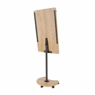 Natürlich und warm: Mobiles Flipchart in hochwertiger Holzoptik (Eiche). Leichtes Bewegen: Ohne Kraftaufwand verschieben durch die runde Form des Fußes. Flexibel: Universelles Hakensystem für alle handelsüblichen Blöcke.