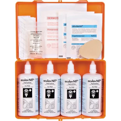 - 4 x 250 ml Druckspülflaschen, Augenkompressen, Augenklappe, Pflasterstreifen, Kompresse, Einwegschutzhandschuhe