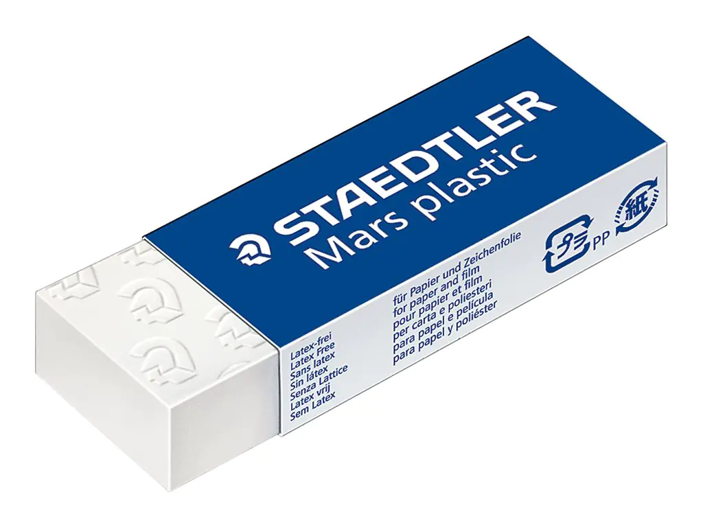 Phthalat- und latexfrei, absolut alterungsbeständig, effiziente Produktion MADE IN GERMANY, beste Radierleistung bei geringer Abnutzung, kein Abfärben der Radierer auf dem Papier, Premiumqualität für erstklassige Radierergebnisse, minimale Krümelbildung. Mit Schiebemanschette aus Karton, zellophaniert.