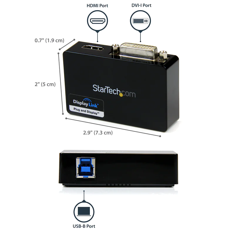 StarTech.com USB 3.0 auf HDMI / DVI Video Adapter - Externe Dual Multi Monitor Grafikkarte - 1920x1200 - Videoadapter - TAA-konform - USB Type B weiblich zu DVI-I, HDMI weiblich - Schwarz - 2048 x 1152 Support 60 Hz - für P/N: HDDVIMM3, HDMM12, HDMM15, HDMM1MP, HDMM2MP, HDMM3, HDMM3MP, HDMM50A, HDMM6, HDPMM50