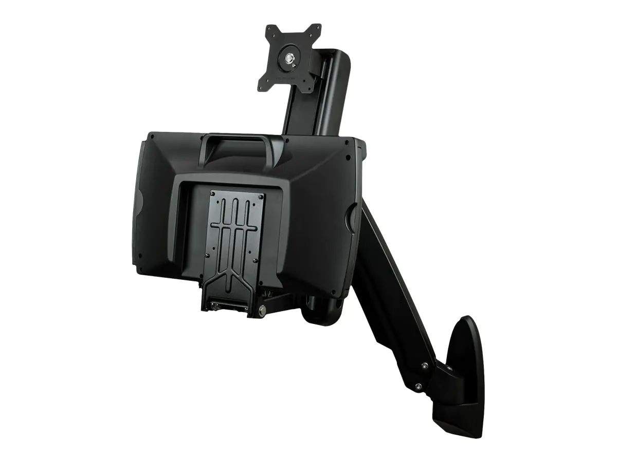 - Sparen Sie Platz mit diesem wandmontierten Steh-Sitz-Tisch, der Folgendes unterstützt: einen Monitor, Barcode-Scanner, Tastatur, Handballenauflage und Maus in einem Kombi-System