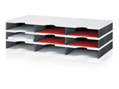 Stabile und flexible Papier- und Dokumentenablage. Vielfältiger Einsatz - verwendbar freistehend auf dem Tisch, Regalen und Schränken oder auch als kleine Drucker- oder Faxstation. Jederzeit erweiterbar durch einfache Steckmontage.