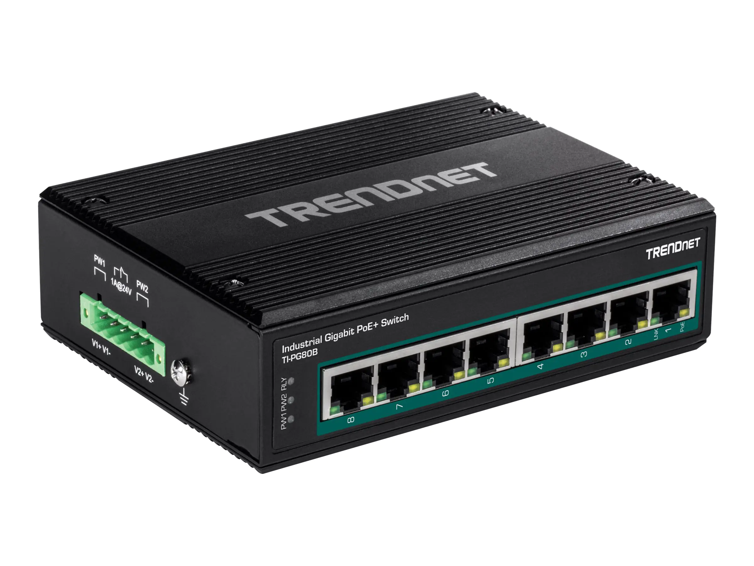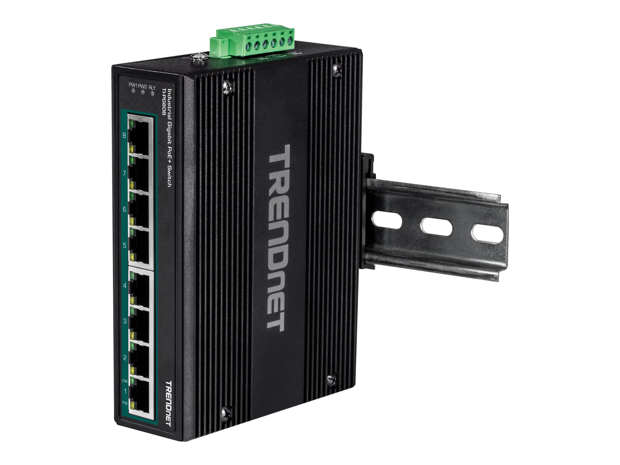 Der 8-Port industrielle Gigabit PoE+ DIN-Rail-Switch von TRENDnet, Modell TI-PG80B, ist ein industrieller variabler Spannungswandler mit acht Gigabit PoE+ Ports und einer PoE-Gesamtleistung von 200W. Benutzer können acht PoE+-Geräte an diesen industriellen PoE+-Switch mit variabler Spannung anschließen, um eine schnelle Verbindung zum Netzwerk herzustellen. Der industrielle PoE+-Switch mit variabler Spannung ist mit einem robusten Metallgehäuse nach IP30 ausgestattet und so konzipiert, dass er einem hohen Grad an Vibration und Schock standhält und gleichzeitig in einem weiten Temperaturbereich von -40° bis 75 °C für industrielle Umgebungen eingesetzt werden kann. Zwei 24-56V DC-Netzeingänge am industriellen Switch mit variabler Spannung sorgen für Redundanz mit Netzausfallalarmrelais.